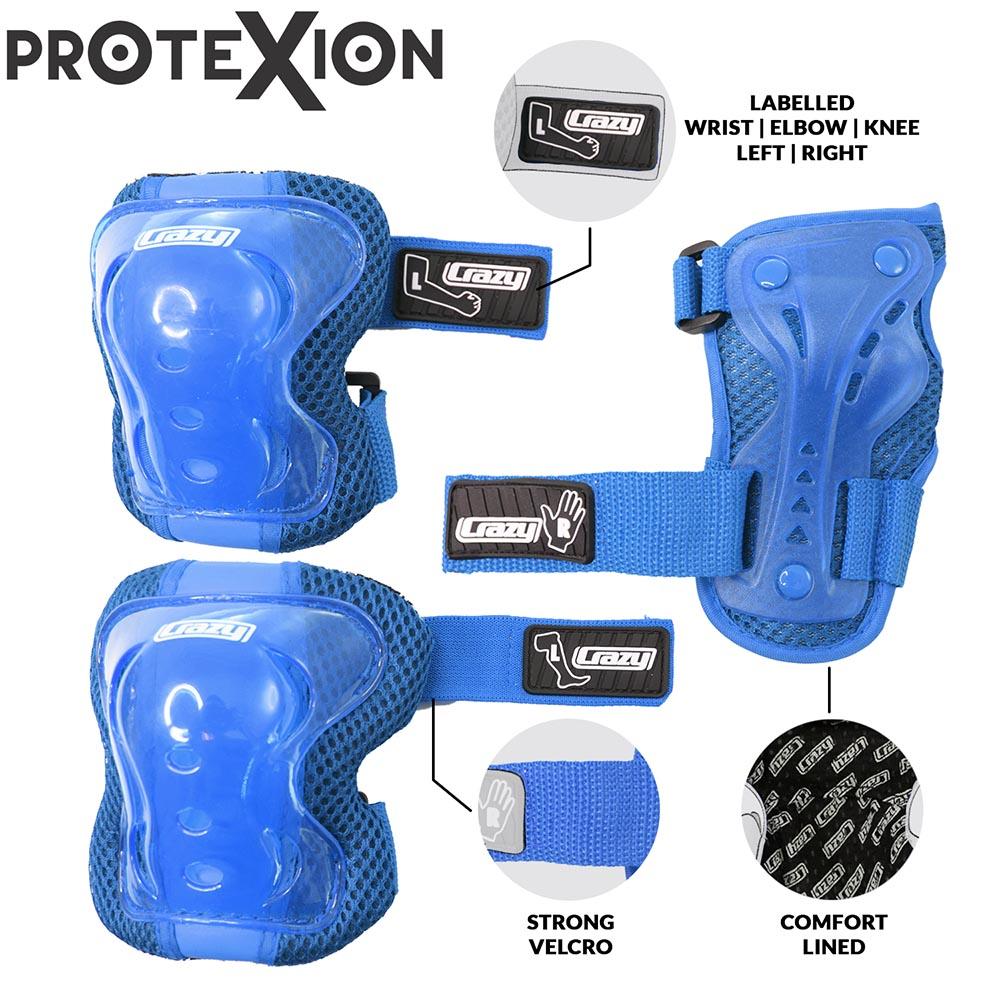 The ProteXion pack from Crazy Skates is the ultimate protective gear set for children who love to roller skate, skateboard, or inline skate. This pack includes a triple set of protective equipment, including knee pads, elbow pads, and wrist pads, all designed to keep your child safe from potential injuries.