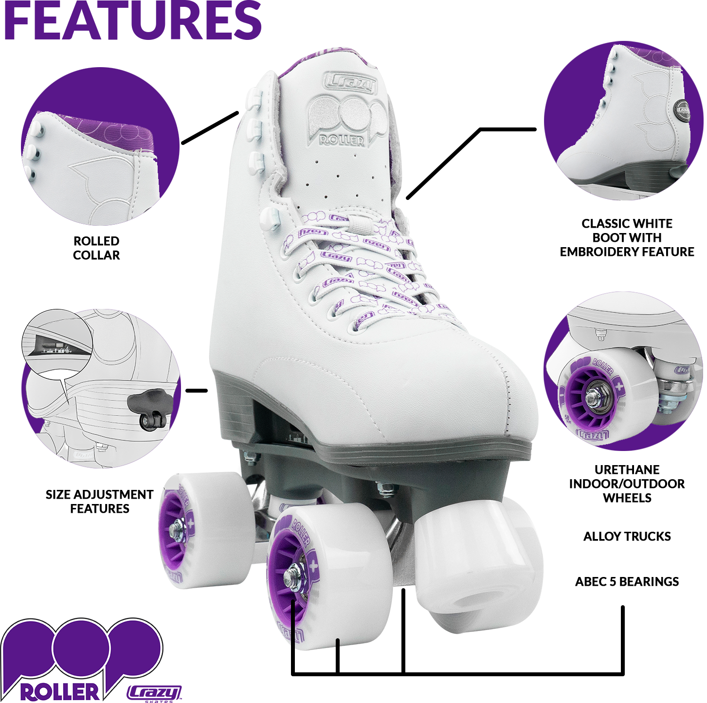 Pop Roller is a classic quad skate with a brand-new size adjustment system that quickly and easily adjusts to fit four different shoe sizes.
