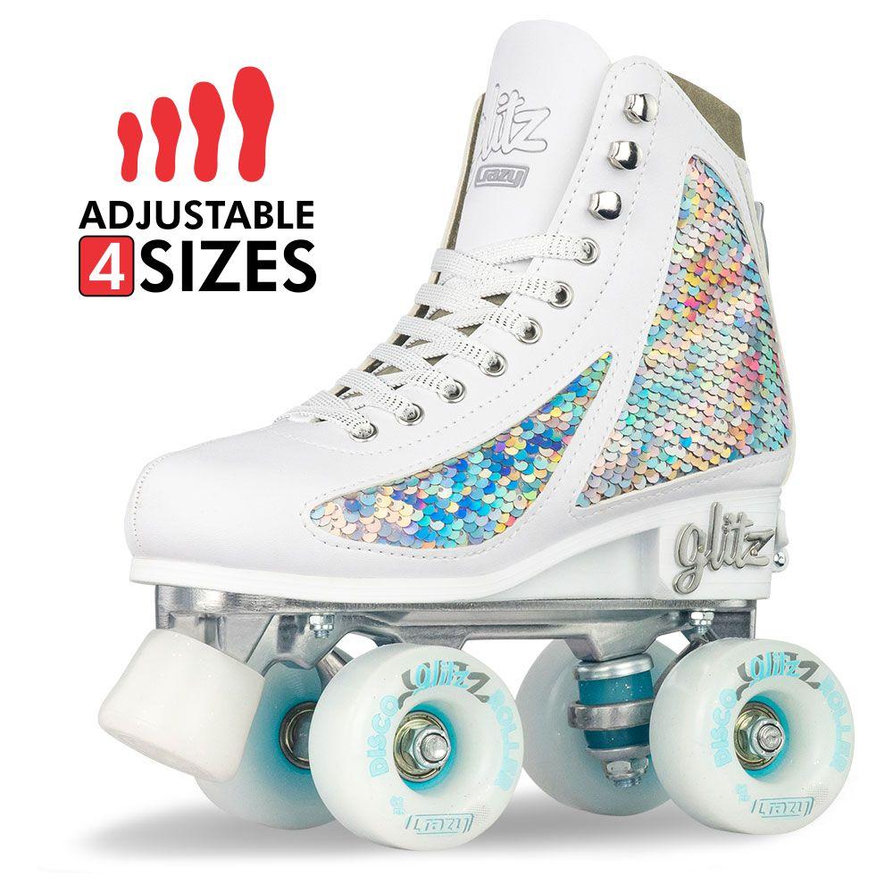 Glitz Size Adjustable Mermaid Roller Skates are the perfect blend of style and performance. Designed from toe to heel to be a show stopper, these retro-style high-white boots feature unique, glimmering two-toned sequin panels and padded collars with thick comfort lining.