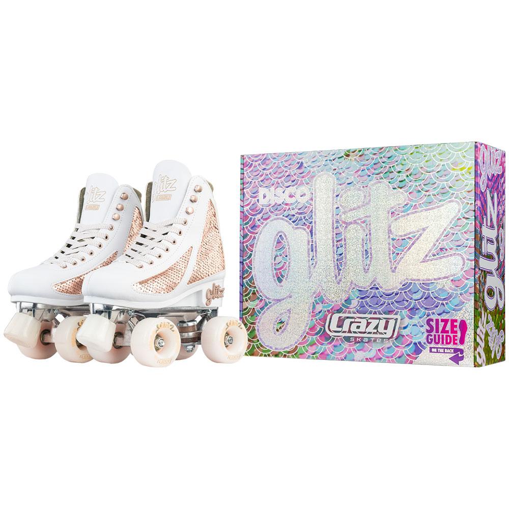 The skates sit solidly upon high-quality alloy trucks and alloy skate plates with glitter-infused bushings, providing both durability and speed. The white glitter laces and metal lace hooks keep your feet securely locked in while you speed along on Crazy Skates’ signature urethane wheels and ABEC-7 speed bearings.