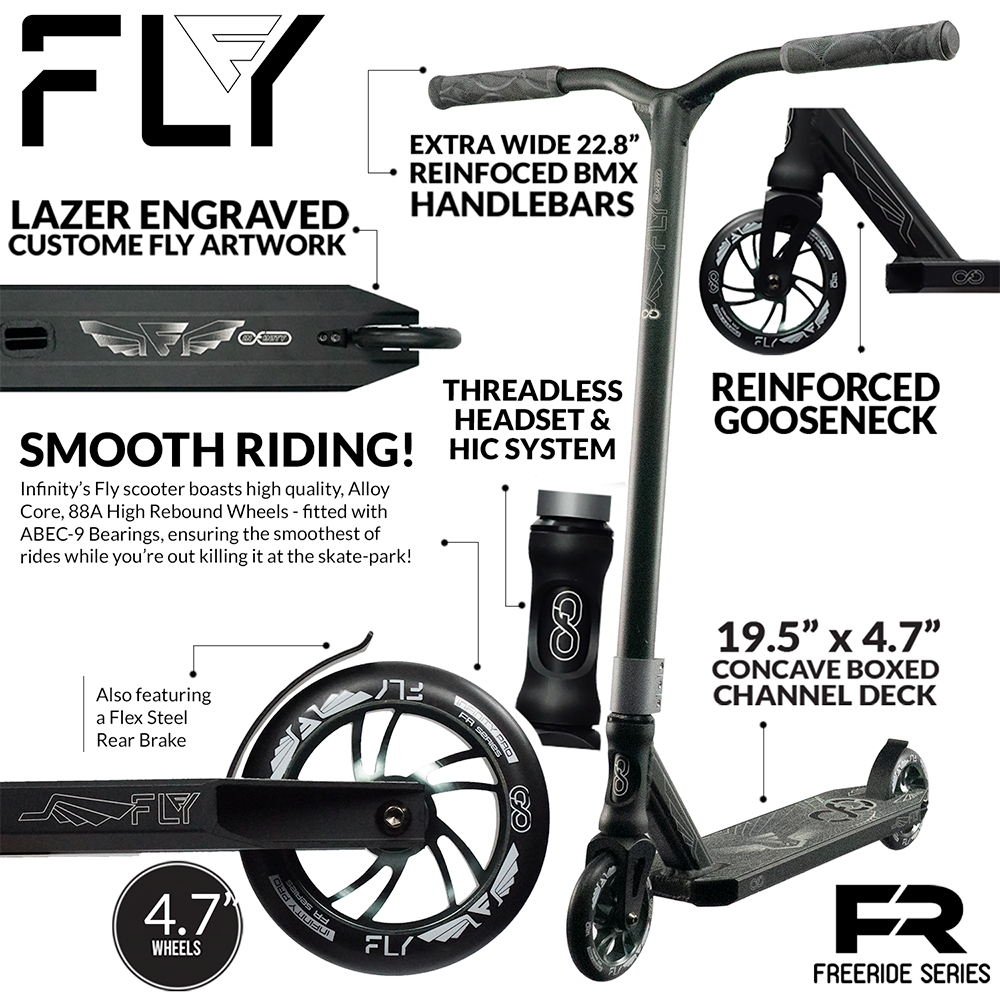 Experience the thrill of 'air-time' like never before with the all-new FLY FreeRide FR Series Pro infinity Scooter. Designed to deliver superior style, ultimate rideability, and exceptional components, the FLY is arguably one of the most stylish and technically advanced scooters on the market for its price point.